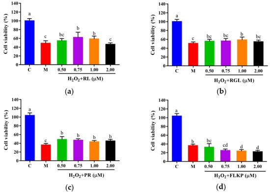 Cell viabilities of HepG2 cells with oxidative stress treated with synthetic peptides: (a) synthetic peptide RL; (b) synthetic peptide RGL; (c) synthetic peptide PR; (d) synthetic peptide FLKP. “C” represents the control group, and “M” represents the model group. Data were expressed as mean ± SD (n3, p < 0.05). Different letters indicate significant differences (p < 0.05).