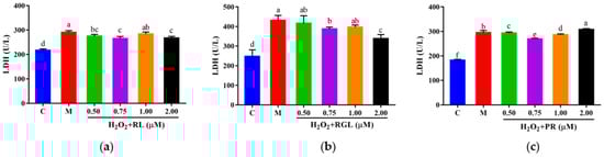 LDH level of HepG2 cells with oxidative stress treated with synthetic peptides: (a) synthetic peptide RL; (b) synthetic peptide RGL; (c) synthetic peptide PR. “C” represents the control group, and “M” represents the model group. Data were expressed as mean ± SD (n ≥ 3, p < 0.05). Different letters indicate significant differences (p < 0.05).