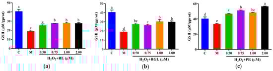 GSH level of HepG2 cells with oxidative stress treated with synthetic peptides: (a) synthetic peptide RL; (b) synthetic peptide RGL; (c) synthetic peptide PR. “C” represents the control group, and “M” represents the model group. Data were expressed as mean ± SD (n ≥ 3, p < 0.05). Different letters indicate significant differences (p < 0.05).