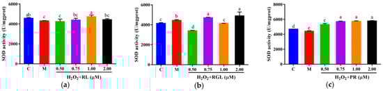 SOD activity of HepG2 cells with oxidative stress treated with synthetic peptides: (a) synthetic peptide RL; (b) synthetic peptide RGL; (c) synthetic peptide PR. “C” represents the control group, and “M” represents the model group. Data were expressed as mean ± SD (n ≥ 3, p < 0.05). Different letters indicate significant differences (p < 0.05).