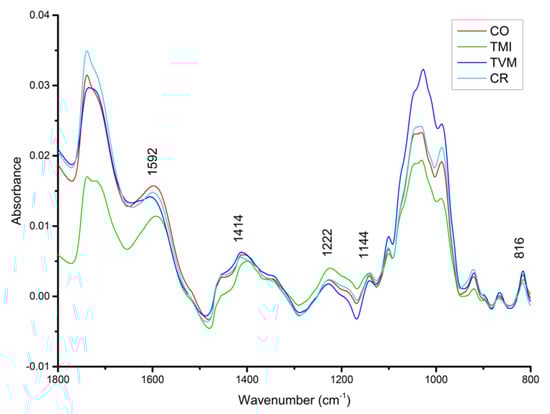 Since the phenolic compounds should be the main compounds responsible for the extracts´ antioxidant activity, the subsequent analysis will focus only on the bands assigned to these constituents (Figure 2) by comparing the relative intensity of these bands (semiquantitative approximation). For each spectral region of interest, the genotypes were classified from higher to lower intensity of the bands (Figure 2) as follows: 1592 cm−1—CO, CR, TVM, TMI; 1414 cm−1—TVM, CO, CR, TMI; 1222 cm−1—TMI, CR, CO, TVM; 1144 cm−1—CR, TMI, CO, TVM; 816 cm−1—TVM, CO, TMI, CR.
