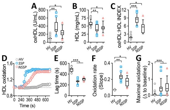 HDL and oxHDL plasma levels in SSP and NSSP and oxidation kinetic parameters. (A–D) Blood samples were collected from HV (grey circle), SSP (blue square) and NSSP (red triangle) to measure plasma levels of oxHDL (A), HDL (B) and INDEX (C). (D) Representative traces for HDL time-lapse oxidation progression from native HDL obtained from HV (grey circles), SSP (red circles) and NSSP (blue circles). (E–G) Determination of lag time (E), oxidation rate (F) and maximal oxidation (G) for native HDL obtained from HV (grey circles), SSP (red circles) and NSSP (blue circles). Statistical differences were assessed by a one-way analysis of variance (ANOVA) (Kruskal–Wallis) followed by Dunn’s post hoc test. * p < 0.05, ** p < 0.01, *** p < 0.001. Values are expressed as the median ± 10–90 percentile.