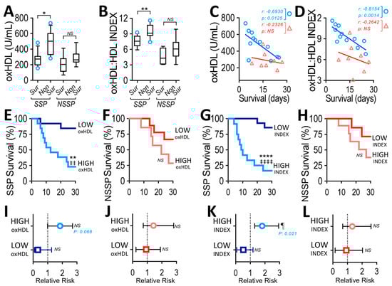 OxHDL plasma level and INDEX in surviving and non-surviving patients, survival time correlation, survival curve comparisons and relative risk of death analyses in SSP and NSSP. (A,B) Plasma level of oxHDL (A) and INDEX (B) in surviving and non-surviving SSP (blue circles) and NSSP (red triangles). Statistical differences were assessed with student’s t-test (Mann–Whitney) for SSP and NSSP. * p < 0.05, ** p < 0.01, NS: non-significant. Values are expressed as the median ± 10–90 percentile. (C,D) Correlation analyses between oxHDL (B) and INDEX (C) with days of permanence at ICU for non-surviving patients within a 30-day time frame in SSP (blue circle) and NSSP (red triangle) groups (r = −0.6930; p = 0.0125 and r = −0.2326; p = 0.5793, respectively, for C, and r = −0.8154; p = 0.0012 and r = −0.2642; p = 0.5271, respectively, for (D)). Survival (Kaplan–Meier) curves within a 30-day time frame for SSP (E,G) and NSSP (F,H) comparing high- and low-oxHDL (E,F) or comparing high- and low-INDEX (G,H). ** p = 0.01 (log-rank (Mantel–Cox) test) ‡‡, p = 0.01 (Gehan–Breslow–Wilcoxon test) when comparing high-oxHDL versus low-oxHDL groups. **** p < 0.0001 (log-rank (Mantel–Cox) test). ‡‡‡‡, p < 0.0001 (Gehan–Breslow–Wilcoxon test) when comparing high-INDEX versus low-INDEX groups. NS: non-significant. Contingency analyses performed to determine relative risk in SSP (I,K) and NSSP (J,L) comparing high- and low-oxHDL groups (I,J) or high- and low-INDEX groups (K,L). Values are expressed as the mean ± 95% CI. ¶ p = 0.021 (Fisher’s exact test) comparing high- versus low-oxHDL level groups within a 30-day time frame. NS: non-significant.