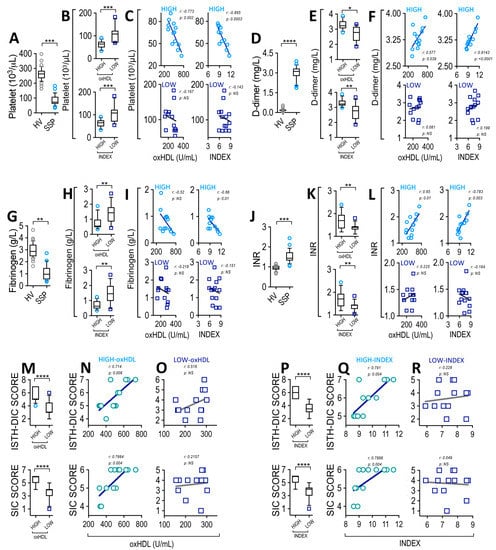 Plasma level of ISTH-DIC and SIC parameters correlates with oxHDL and INDEX in SSP. Plasma level of platelet count (A), D-dimer (D), fibrinogen (G), and INR (J) in HV and SSP. Plasma level of platelet count (B), D-dimer (E), fibrinogen (H), and INR (K) in high- and low-oxHDL and high- and low-INDEX groups from SSP. Statistical differences were assessed with student’s t-test (Mann–Whitney). * p < 0.05, ** p < 0.01, *** p < 0.001, **** p < 0.0001. Correlation analyses between: platelet count with high-oxHDL ((C), upper-left panel, r = −0.773; p = 0.002), low-oxHDL ((C), lower-left panel, r = −0.167; p = NS), high-INDEX ((C), upper-right panel, r = −0.865; p = 0.0003) and low-INDEX ((C), lower-right panel, r = −0.1430; p = NS), D-dimer with high-oxHDL ((F), upper-left panel, r = 0.577; p = 0.039), low-oxHDL ((F), lower-left panel, r = 0.081; p = NS), high-INDEX ((F), upper-right panel, r = 0.9143; p < 0.0001) and low-INDEX ((F), lower-right panel, r = 0.1998; p = NS), fibrinogen with high-oxHDL ((I), upper-left panel, r = −0.52; p = NS), low-oxHDL ((I), lower-left panel, r = −0.2185; p = NS), high-INDEX ((I), upper-right panel, r = −0.660; p = 0.01) and low-INDEX ((I), lower-right panel, r = −0.1518; p = NS), INR with high-oxHDL ((L), upper-left panel, r = 0.650; p = 0.01), low-oxHDL ((L), lower-left panel, r = 0.2275; p = NS), high-INDEX ((L), upper-right panel, r = 0.783; p = 0.003) and low-INDEX ((L), lower-right panel, r = −0.184; p = NS). (M–R) SIC score determination in high- and low-oxHDL (M) and high- and low-INDEX (P) groups from SSP. Statistical differences were assessed with student’s t-test (Mann–Whitney). **** p < 0.0001. SIC score determination in oxHDL plasma level and INDEX SSP in high and low groups. Correlation analyses betweenSIC score with high-oxHDL ((N), r = 0.714; p = 0.008 and r = 0.7664; p = 0.004, respectively), SIC score with low-oxHDL ((O), r = 0.516; p = NS and r = 0.2157; p = NS, respectively), SIC score with high-INDEX ((Q), r = 0.791; p = 0.004 and r = 0.7898; p = 0.004, respectively), SIC score with low-INDEX ((R), r = 0.228; p = NS and r = 0.049; p = NS, respectively).