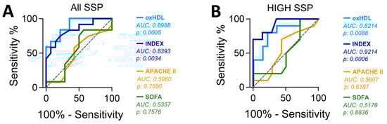 To evaluate the capacity to predict mortality through measuring the plasma oxHDL level and INDEX from SSP, we used an area under the receiver operating characteristic curve (AUROC) analysis. The plasma oxHDL level and INDEX from SSP showed a high predictive capacity (Figure 4) showing AUROC values superior to the diagonal nondiscrimination line, which denotes their statistical significance. The AUROC analysis performed in all SSP showed that the oxHDL level is a better predictor than INDEX (Figure 4A). Interestingly, when AUROC analysis was performed in high-oxHDL and high-INDEX SSP groups, INDEX was a better predictive marker than oxHDL level (Figure 4B). Notably, in both cases, the capacity to predict mortality outcomes based on oxHDL and INDEX was better when compared with the APACHE-II and SOFA scores, which are scores of severity and prognosis, respectively, and are widely used for critical patient evaluations (Figure 4A,B).