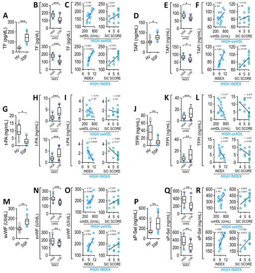 Plasma level of coagulation factors and soluble platelet adhesion proteins correlates with oxHDL and INDEX in SSP. Plasma level of TF (A), TAFI (D), t-PA (G), TFPI (J), svWF (M) and sP-Sel (P) in HV and SSP. Plasma level of TF (B), TAFI (E), t-PA (H), TFPI (K), svWF (N) and sP-Sel (Q) in high- and low-oxHDL and high- and low-INDEX groups from SSP. Statistical differences were assessed with student’s t-test (Mann–Whitney). * p < 0.05, ** p < 0.01, *** p < 0.001. Values are expressed as the median ± 10–90 percentile. Correlation analyses between: TP with high-oxHDL ((C), left panel, r = 0.728; p = 0.005), SIC score from high-oxHDL ((C), middle-left panel, r = 0.612; p = 0.032), high-INDEX ((C), middle-right panel, r = 0.929; p < 0.0001) and SIC score from high-INDEX ((C), right panel, r = 0.7575; p = 0.0043), TAFI with high-oxHDL ((F), left panel, r = 0.502; p = 0.08), SIC score from high-oxHDL ((F), middle-left panel, r = 0.3133; p = 0.297), high-INDEX ((F), middle-right panel, r = 0.877; p = 0.002) and SIC score from high-INDEX ((F), right panel, r = 0.6828; p = 0.0144), t-PA with high-oxHDL ((I), left panel, r = −0.2726; p = 0.3676), SIC score from high-oxHDL ((I), middle-left panel, r = −0.202; p = 0.509), high-INDEX ((I), middle-right panel, r = −0.7789; p = 0.0028) and SIC score from high-INDEX ((I), right panel, r = −0.696; p = 0.011), TFPI with high-oxHDL ((L), left panel, r = −0.517; p = 0.071), SIC score from high-oxHDL ((L), middle-left panel, r = −0.674; p = 0.027), high-INDEX ((L), middle-right panel, r = −0.5823; p = 0.047) and SIC score from high-INDEX (L, right panel, r = −0.621; p = 0.039), svWF with high-oxHDL ((O), left panel, r = 0.7276; p = 0.0048), SIC score from high-oxHDL ((O), middle-left panel, r = 0.7276; p = 0.0048), high-INDEX ((O), middle-right panel, r = 0.821; p = 0.002) and SIC score from high-INDEX ((O), right panel, r = 0.7475; p = 0.0043), sP-Sel with high-oxHDL ((R), left panel, r = 0.6429; p = 0.1389), SIC score from high-oxHDL ((R), middle-left panel, r = 0.6552; p = 0.0441), high-INDEX ((R), middle-right panel, r = 0.929; p < 0.0001) and SIC score from high-INDEX ((R), right panel, r = 0.7285; p = 0.0072).