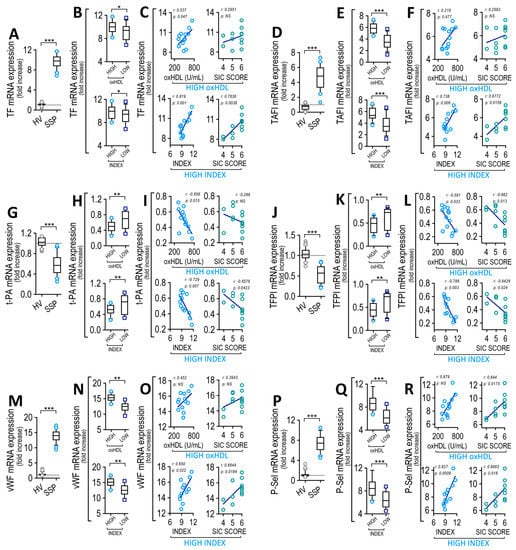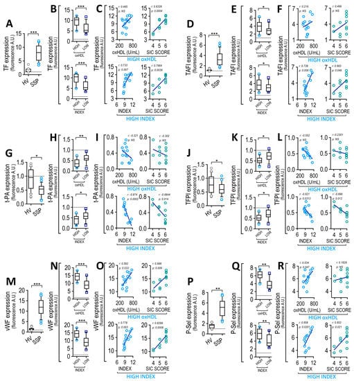 Coagulation factors and soluble platelet adhesion protein expression in CMEC from SSP. Normalized expression level of TF (A), TAFI (D), t-PA (G), TFPI (J), svWF (M) and sP-Sel (P) in HV and SSP. Plasma level of TF (B), TAFI (E), t-PA (H), TFPI (K), svWF (N) and sP-Sel (Q) in high- and low-oxHDL and high- and low-INDEX groups from SSP. Statistical differences were assessed with student’s t-test (Mann–Whitney). * p < 0.05, ** p < 0.01, *** p < 0.001. Values are expressed as the median ± 10–90 percentile. Correlation analyses between: TP with high-oxHDL ((C), left panel, r = 0.465; p = 0.109), SIC score from high-oxHDL ((C), middle-left panel, r = 0.8328; p = 0.0004), high-INDEX ((C), middle-right panel, r = 0.733; p = 0.007) and SIC score from high-INDEX ((C), right panel, r = 0.7664; p = 0.0036), TAFI with high-oxHDL ((F), left panel, r = 0.2168; p = 0.477), SIC score from high-oxHDL ((F), middle-left panel, r = 0.499; p = 0.167), high-INDEX (F, middle-right panel, r = 0.738; p = 0.006) and SIC score from high-INDEX ((F), right panel, r = 0.663; p = 0.048), t-PA with high-oxHDL ((I), left panel, r = −0.3213; p = 0.2845), SIC score from high-oxHDL ((I), middle-left panel, r = −0.302; p = 0.3169), high-INDEX ((I), middle-right panel, r = −0.8743; p = 0.0002) and SIC score from high-INDEX (I, right panel, r = −0.6844; p = 0.03169), TFPI with high-oxHDL ((L), left panel, r = −0.552; p = 0.0505), SIC score from high-oxHDL ((L), middle-left panel, r = −0.2301; p = 0.4495), high-INDEX ((L), middle-right panel, r = −0.621; p = 0.0313) and SIC score from high-INDEX ((L), right panel, r = −0.698; p = 0.012), vWF with high-oxHDL ((O), left panel, r = 0.592; p = 0.033), SIC score from high-oxHDL ((O), middle-left panel, r = 0.688; p = 0.009), high-INDEX ((O), middle-right panel, r = 0.778; p = 0.003) and SIC scores from high-INDEX ((O), right panel, r = 0.8299; p = 0.0008), P-Sel with high-oxHDL ((R), left panel, r = 0.5344; p = 0.047), SIC score from high-oxHDL ((R), middle-left panel, r = 0.1826; p = 0.5504), high-INDEX ((R), middle-right panel, r = 0.658; p = 0.0201) and SIC score from high-INDEX ((R), right panel, r = 0.653; p = 0.021). Dotted line depicts normalized expression obtained in non-treated EC cultures.