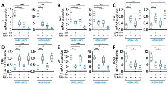 Effects of LOX-1 and TLR-4 recepto inhibitors in coagulation factors and platelet adhesion protein mRNA expression in cultured EC exposed to plasma from SSP. Plasma samples were collected from high-oxHDL and high-INDEX SSP blood samples and then added to cultured EC for 24 h, in the absence (−) or presence (+) of the neutralizing antibody against LOX-1 function (LOX-1 inh) and the TLR-4-specific inhibitor CLI-095 (TLR-4 inh), and then mRNA expression of coagulation factors and platelet adhesion proteins were measured. Normalized mRNA expression of TF (A), TAFI (B), t-PA (C), TFPI (D), vWF (E) and P-Sel (F) were measured in EC cultures exposed to high-oxHDL (left panels) and high-INDEX (right panels) plasma samples. Statistical differences were assessed by a one-way analysis of variance (ANOVA) (Kruskal–Wallis) followed by Dunn’s post hoc test. * p < 0.05, ** p < 0.01, *** p < 0.001, **** p < 0.0001. Values are expressed as the median ± 10–90 percentile. NS: non-significant. Dotted line depicts normalized expression obtained in non-treated EC cultures.