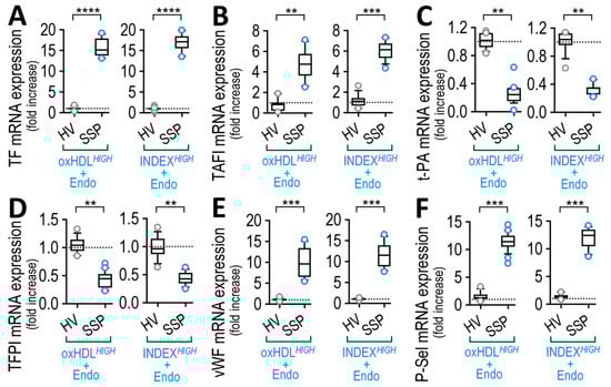 The results indicated that ECs exposed to an exogenous preparation of SSP-oxHDLHIGH+Endo and SSP-INDEXHIGH+Endo elicited an increase in TF and TAFI mRNA expression (Figure 9A and B, respectively). Furthermore, ECs exposed to SSP-oxHDLHIGH+Endo and SSP-INDEXHIGH+Endo showed a decrease in the expression of t-PA and TFPI mRNA expression (Figure 9C and D, respectively). In addition, ECs exposed to SSP-oxHDLHIGH+Endo and SSP-INDEXHIGH+Endo showed an increase in the mRNA expression of adhesion proteins vWF and P-Sel (Figure 9E,F, respectively). The treatment with exogenous SSP-oxHDLLOW+Endo and SSP-INDEXLOW+Endo yielded no significant effects compared to HV-oxHDL and HV-INDEX, respectively (not shown).