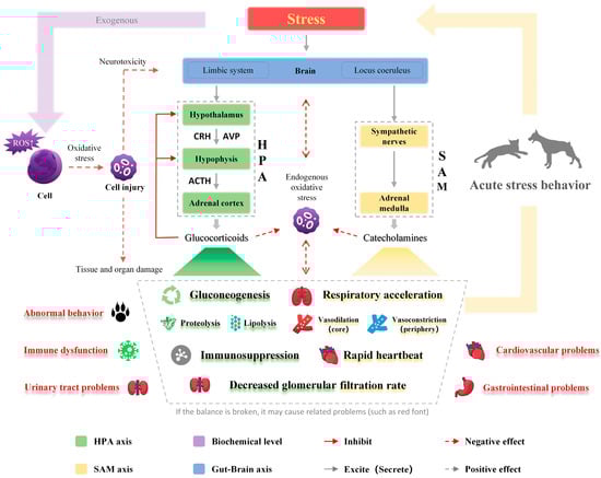 Acute stress can enhance innate immunity in order to better cope with adverse changes. The underlying mechanism may be that norepinephrine and other stress hormones induce the recruitment of dendritic cells and the increase in macrophages at antigen exposure sites, thereby enhancing the primary immune response [73]. Under acute stress conditions, the total number of white blood cells also increases [74]. However, continuous activation of the HPA axis will lead to leukopenia [75]. Increased glucocorticoids have been shown to exert a strong immunosuppressive effect by inhibiting cytokine production, macrophage function, lymphocyte proliferation and differentiation, and natural killer cell activity [76,77]. Therefore, chronic stress can lead to immunosuppression and increase the risk of pathogen invasion. For example, contraction of feline infectious peritonitis due to feline coronavirus has been linked to oxidative stress and decreased antioxidant status in cats [78].