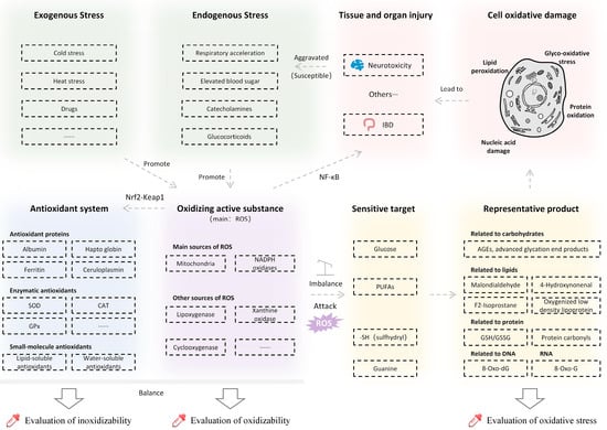 Oxidative stress refers to when the production of oxidants exceeds the antioxidative capacity of the body, leading to the disruption of redox (i.e., oxidation/reduction reactions) homeostasis and ubiquitous damage to cellular, tissue, and organ systems [41]. The mechanism of oxidative stress is shown in Figure 2.
