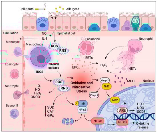 Schematic representation of oxidative and nitrosative stress in the pathophysiology of asthma. Recruitment (e.g., via IL-8) and activation of inflammatory cells such as neutrophils, macrophages, and eosinophils result in the release of ROS and RNS as well as NETs + MPO (from neutrophils) and EETs + EPO (from eosinophils), which cumulatively increase H2O2 levels. Macrophages induce the activity of iNOS and NADPH oxidase, resulting in increased release of ROS and RNS, thereby promoting oxidative/nitrosative stress and reducing the activity of antioxidant enzymes. In an attempt to counteract oxidative/nitrosative stress, cells respond to these conditions by activating the transcription factors Nrf2 and NF-κB, which will translocate to the nucleus and transcribe antioxidant enzymes and cytokines, respectively. Heme oxygenase (HO-1); hydrogen peroxide (H2O2); inducible nitric oxide synthase (iNOS); inhibitor of kB (ikB); kelch-like ECH-associated protein 1 (Keap 1); eosinophil peroxidase (EPO); myeloperoxidase (MPO); nicotinamide adenine dinucleotide phosphate (NADPH); nuclear factor erythroid 2-related factor 2 (Nrf2); nuclear factor-κB (NF-κB); nitric oxide (NO); peroxynitrite (ONOO−); quinone oxidoreductase (NQO1); reactive nitrogen species (RNS); reactive oxygen species (ROS); superoxide (O•−); superoxide dismutase (SOD), and superoxide dismutase 3 (SOD3).