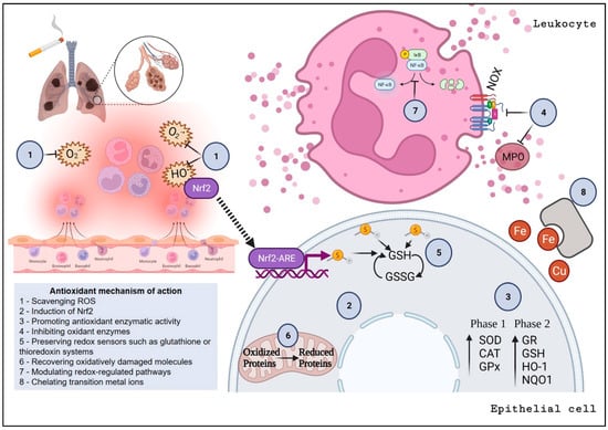 Schematic representation of various antioxidant mechanisms of action. Top left shows induction of oxidative stress and inflammation of the lung microenvironment by cigarette smoke inhalation. On the right, the roles of leukocytes and epithelial cells as well as associated signaling events are outlined. Grey circles numbered from 1 to 8 represent the pathways impacted by exogenous antioxidants and are detailed in the grey box (bottom left).