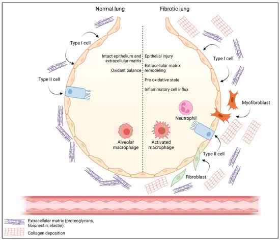 Idiopathic pulmonary fibrosis (IPF) is a progressive and potentially fatal disease with unknown etiology and is associated with aging as well as environmental and occupational factors (e.g., smoking) []. The pathogenesis of IPF is incompletely understood. However, it is well known that abnormal tissue repair and ECM remodeling play a critical role. In IPF, fibroblast migration, proliferation, and differentiation into myofibroblasts occurs. It has been proposed that epithelial to mesenchymal transition (EMT) is an important source of thses (myo)-fibroblasts []. Thus, alveolar epithelial cells undergo EMT, acquiring a more fibroblastic phenotype; concomitantly, proliferation and migration of fibroblasts and myofibroblasts leads to the formation of fibrotic foci (Figure 4) [,]. Progressive and abnormal tissue remodeling leads to modifications in pulmonary structure and function []. Oxidative stress and inflammation have been associated with the promotion of pulmonary fibrosis. These mechanisms, together with the protease/antiprotease imbalance, culminate in cellular apoptosis and the loss of ECM proteins.