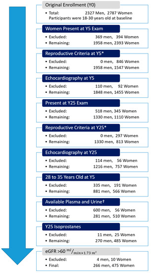 The present study is a cross-sectional analysis of CARDIA participants for whom urinary isoprostane concentrations were measured at the year 25 (Y25) follow-up exam (2010–2011) as part of an ancillary study. Complete inclusion and exclusion criteria for the ancillary study, for which the primary goal was to assess changes in cardiac structure and function during the menopausal transition, are listed in Figure 1. For this analysis, the study population comprised 48- to 55-year-old CARDIA participants who satisfied criteria for availability of questionnaire data, cardiac imaging, and biospecimens in line with the objectives of the parent ancillary study. Participants with estimated glomerular filtration rate (eGFR) <60 mL/min/1.73 m2 using the Modification of Diet in Renal Disease (MDRD) equation [19] were excluded to avoid interpretability issues for urine-based assays in the setting of impaired renal function. Based on the above criteria, 475 women and 266 men were included (Figure 1).