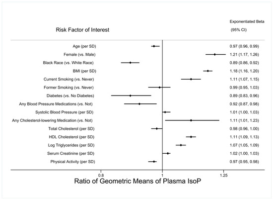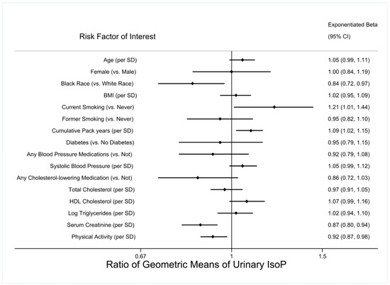 Adjusted associations between IsoP vs. cardiovascular risk factors. Exponentiated beta-coefficients are plotted and are equivalent to geometric ratios of analyte of interest. Ratios > 1 represent positive correlation and ratios < 1 represent inverse correlation. All CVD risk factors are mutually adjusted for one another (age, sex, race, BMI, smoking status, cumulative pack years, diabetes, hypertension medication, systolic blood pressure, lipid-lowering medication, total cholesterol, HDL cholesterol, fasting triglyceride concentrations [log transformed], physical activity) as well as for college attainment and study center. Smoking status and cumulative pack years were highly correlated and thus were not mutually adjusted when one was considered an independent variable of interest.