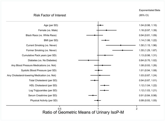 Adjusted associations between IsoP m vs. cardiovascular risk factors. Exponentiated beta-coefficients are plotted and are equivalent to geometric ratios of analyte of interest. Ratios > 1 represent positive correlation and ratios < 1 represent inverse correlation. All CVD risk factors are mutually adjusted for one another (age, sex, race, BMI, smoking status, cumulative pack years, diabetes, hypertension medication, systolic blood pressure, lipid-lowering medication, total cholesterol, HDL cholesterol, fasting triglyceride concentrations [log transformed], physical activity) as well as for college attainment and study center. Smoking status and cumulative pack years were highly correlated and thus were not adjusted for one another in their respective models.