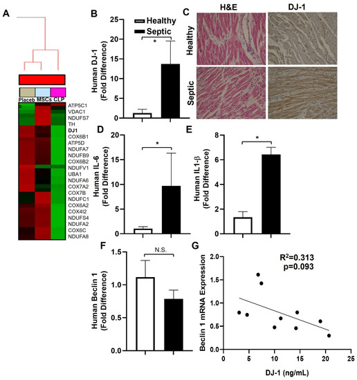 Identification of DJ-1/PARK7 through Bioinformatic Analyses and Expression in Human Septic Patients. (A) Gene expression profile of Kegg Parkinson’s disease gene-set in the heart after treatment with MSCs. The data used was from LIMMA analysis (N = 45,281 genes) comparing CLP + Placebo vs. CLP + MSCs and identified through Gene Set Enrichment Analysis (GSEA). (B) Bars are DJ-1/18S mRNA expression + SEM in in archival myocardial samples from patients deceased from severe sepsis with myocardial dysfunction and myocardial (non-malignant) tissue from cancer patients serving as control. (C) Representative photomicrographs (×400) sections of formalin-fixed paraffin-embedded myocardia tissue from a human subject (male, 58 years old), who died from cancer, serving as control and a human subject (male, 44 years old) deceased from severe sepsis with myocardial dysfunction showing H&E staining and cytosolic expression of DJ-1. Bar = 20 μ. (D–F) Bars are mean + SEM of gene/18S mRNA expression in archival myocardial samples of patients who died from severe sepsis with myocardial dysfunction and myocardial (non-malignant) tissue from cancer patients serving as control. n = 5–10, N.S. – not significant, * p < 0.05. (G) Correlation of septic DJ-1 vs. beclin 1mRNA levels. n = 10.