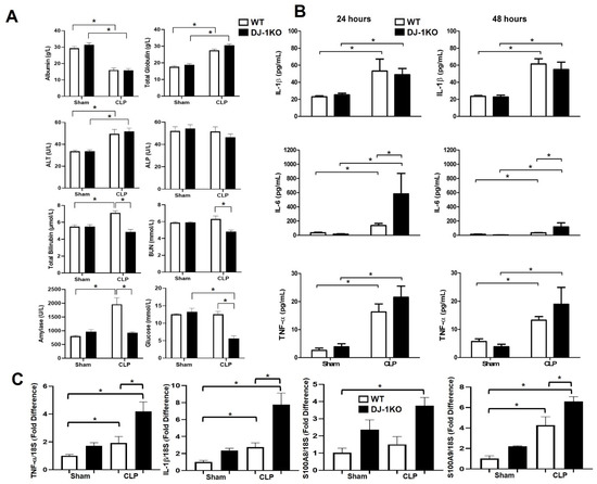 Total globulin and alanine amino transferase (ALT) were increased whereas albumin was decreased equally in both genotypes. Total bilirubin, blood urea nitrogen (BUN), amylase, and glucose levels were lower in DJ-1KO compared to WT post-CLP mice (Figure 3A). The inflammatory cytokines TNF-α, IL-6, and IL-1β were increased in the serum of WT and DJ-1KO mice at 24 and 48 h post-CLP (Figure 3B). Moreover, IL-6 was increased to a greater extent in DJ-1KO compared to WT post-CLP at both time points (Figure 3B). In heart tissue, TNF-α and IL-1β mRNA levels were increased 48 h post-CLP, albeit to a greater extent in DJ-1KO (Figure 3C). Additionally, the expression levels of inflammatory S100 family members S100A8 and S100A9, also referred to as damage-associated molecular patterns (DAMPs), that signal cellular damage to resident cells via molecular pattern recognition receptors, were also increased 48 h post-CLP in the hearts of WT and DJ1KO (Figure 3C). These results confirm previous findings of DJ-1 as a regulator of inflammation [27]. More importantly, they delineate levels of inflammation with cardiac dysfunction.