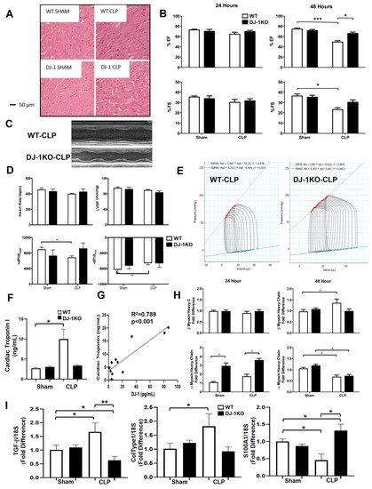 Next, we investigated cardiac structural and functional parameters by echocardiography and hemodynamic assessment at 24 and 48 h post CLP in WT and DJ-1. Histological analysis showed mild to moderate myofibrillary damage in the myocardium of WT but not DJ-1KO mice (Figure 4A). Alterations in myocardial function were not detected at 24 h post CLP in both WT and DJ-1KO (Figure 4C). At 48 h CLP, WT mice developed sepsis-induced myocardial depression as assessed by decreases in left ventricular ejection fraction (EF) and fractional shortening (FS) derived from M-mode echocardiography tracings (Figure 4B, C). In contrast, DJ-1KO mice did not develop myocardial depression post-CLP (Figure 4C). Hemodynamic assessment at 48 h post-CLP, showed no changes in heart rate and LV systolic pressure in both WT and DJ-1KO mice (Figure 4D). However, contractility (+dp/dt and −dp/dt) was reduced only in WT mice 48 h post-CLP (Figure 4D). When compared with WT, end-systolic pressure-volume relation (ESPVR) was increased in DJ-1KO post-CLP, indicative of improved cardiac contractility (Figure 4E). Plasma cardiac troponin levels only increased in the WT group 48 h post-CLP (Figure 4F). Interestingly, there was a positive correlation between septic plasma DJ-1 vs. cardiac troponin. These findings suggest that DJ-1 deficiency offers protection against CLP-induced myocardial depression. An examination of hypertrophic markers showed that the fetal isoform of β myosin heavy chain (MHC) associated with progressive myocardial dysfunction was induced only in the myocardium of WT mice at 48 h post CLP (Figure 4E). The absence of DJ-1 increased the expression of the adult isoform αMHC at 24 h (both in sham and CLP mice and waning off by 48 h (Figure 4E). The expression of markers of fibrosis, TGFβ, and collagen type 1 was also increased only in the myocardium of WT at 48 h post-CLP (Figure 3G). The S100 family member S100A1 is a regulator of sarcoplasmic reticulum Ca2+ handling as well as myofilament and mitochondrial function, thus enhancing the heart’s lusitropic and inotropic states [34]. In the myocardium of WT mice, CLP decreased S100A1 expression. Whereas in DJ-1KO, CLP increased the expression of myocardial S100A1 (Figure 4G). These results suggest that the abrogation of DJ-1 post-CLP preserves cardiac function.