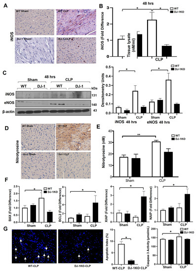 To investigate the molecular mechanisms underlying the differences in cardiac outcomes, we next investigated the expression of inducible NOS (iNOS), which has been implicated in sepsis-induced myocardial depression [8]. Immunohistochemistry analyses of iNOS protein at 48 h confirmed attenuated expression of iNOS in DJ-1KO hearts compared to WT hearts, following CLP surgery (Figure 5A). Notably, iNOS expression in the DJ-1KO hearts appears to only be stained in infiltrating cells but not in parenchymal cells. Expression of iNOS mRNA and protein was increased in the myocardium of WT but not DJ-1KO mice 48 h post-CLP (Figure 5B,C). eNOS protein was similarly lower in DJ-1KO mice compared with WT mice at 48 h post-CLP (Figure 5C). Nitrotyrosine is a product of tyrosine nitration and an indicator of inflammation, nitric acid production, and cell damage. Immunohistochemistry analyses of nitrotyrosine protein at 48 h similarly revealed increased expression in WT hearts but attenuated expression in DJ-1KO hearts (Figure 5D). Nitrotyrosine levels in heart tissue lysates, as determined by ELISA, showed the same trend (Figure 5E). Next, we assessed markers of apoptosis. Proapoptotic BAX was upregulated at 48 h post-CLP in WT mice (Figure 5F). Members of the anti-apoptotic BLC2 family (BCL2, XIAP and NAIP) were selectively upregulated in the hearts of DJ-1KO 48 h post-CLP (Figure 5F). Moreover, there was an increase in myocardial TUNEL positive nuclei and caspase 3 activity in WT compared to DJ-1KO mice 48 h post-CLP. n = 9–11. * p < 0.05.