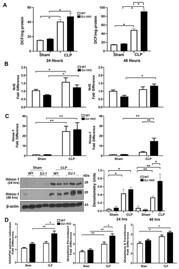 3.7. DJ-1 Deficiency Increases Antioxidant Pathways Post-CLP