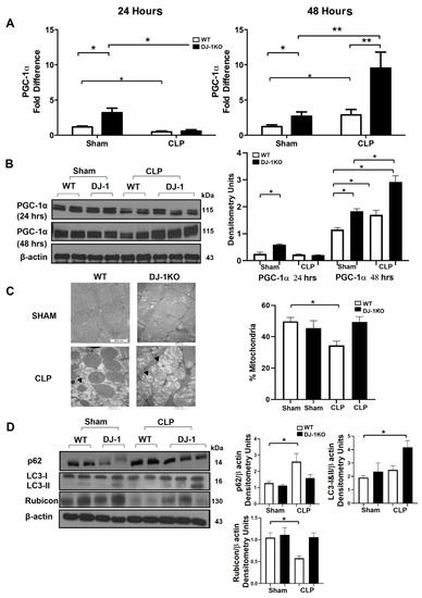 Sepsis-induced myocardial depression is associated with metabolic reprogramming, regulated by peroxisome proliferator-activated receptor gamma coactivator 1α (PGC-1α) [8]. PGC-1α mRNA and protein was decreased in WT and DJ-1 mice 24 h post-CLP (Figure 7A, B). In contrast, at 48 h post-CLP, PGC-1α mRNA and protein increased in both WT and DJ-1KO mice, although to a greater extent in DJ-1KO (Figure 7A,B). These findings collectively reveal that DJ-1KO mice had increased PGC-1α expression supporting a potential role for autophagy in DJ-1KO mice. Next, we explored whether autophagy pathways were involved in the improved pathogen clearance seen in DJ-1 deficient mice [27]. Autophagy has been shown to be upregulated with various stressors, including oxidative stress and inflammation. Upregulation of autophagy has been shown to be protective in experimental models of sepsis. Representative images from 48 h post-CLP showed round or oval double-stranded autophagosome structures (Figure 7C). The WT showed mitochondrial membrane swelling, and a loss of structural integrity and a decrease in mitochondrial content (per cent mitochondria) whereas the DJ-1K, demonstrated an increase in autophagic structures, mitochondrial swelling, minimal loss of mitochondrial integrity, and a similar mitochondrial content to the sham groups (Figure 7C). p62, a marker of autophagy flux, was lower in DJ-1KO hearts, suggesting proper completion of the autophagy cycle (Figure 7D). LC3 lipidation (LC3-II), a critical marker of autophagosome biogenesis, was increased in DJ-1KO hearts compared with WT hearts at 48 h after CLP surgery (Figure 7D). Rubicon is a Beclin 1 binding protein modulating autophagosome maturation and endocytic trafficking [28]. In bone marrow macrophages, we showed that DJ-1 deficiency induces a Rubicon-dependent increase in L3C-associated phagocytosis [29]. We assessed the expression of Rubicon in WT and DJ-1KO hearts following 48 h of CLP. Rubicon protein levels only decreased in the myocardium of WT mice at 48 h post-CLP (Figure 7D).
