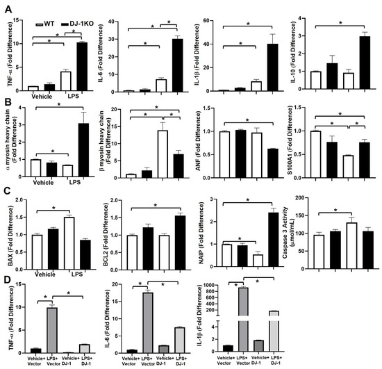 Loss of DJ-1 in cardiomyocytes exacerbates inflammation and represses hypertrophic signaling and apoptosis in response to LPS. (A) Bars are mean + SEM of TNF-α, IL-6, IL-1β, or IL-10 mRNA expression/18S in cardiomyocytes derived from the myocardium of WT and DJ-1KO mice at treated for 24 h with LPS (1 μg/mL). (B) Bars are mean + SEM of aMHC, bMHC, ANF, or S100A1 mRNA expression/18S in cardiomyocytes derived from the myocardium of WT and DJ-1KO mice treated for 24 h with LPS (1 μg/mL). (C) Bars are mean + SEM of BAX, BCL2, and NAIP mRNA expression/18S or caspase 3 activity (mmol/mL) in cardiomyocytes derived from the myocardium of WT and DJ-1KO mice treated for 24 h with LPS (1 μg/mL). (D) WT cardiomyocytes were transfected with a DJ-1 expression plasmid or empty vector and treated 24 h later with vehicle or LPS (1 μg/mL) for an additional 24 h. Bars are mean + SEM of TNF-α, IL-6, and IL-1β mRNA expression/18S. For all, n = 3/group. * p < 0.05.