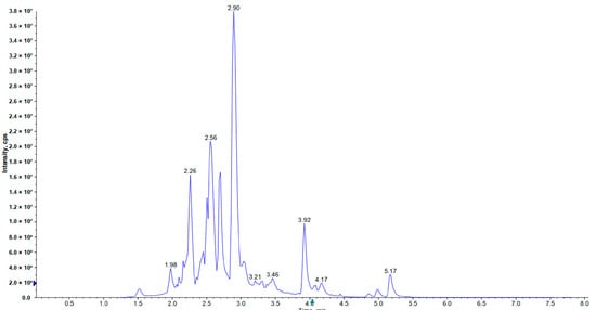 The results showed that the TPC and TFC of HRSF were 327.759 mg GA equiv./g HRSF and 277.356 mg RT equiv./g HRSF, respectively (Table 1). Thus, it could be inferred that flavonoids were the predominant polyphenols in sea buckthorn seeds, which was also demonstrated through the research of Gong et al. [21]. The HPLC-ESI-MS/MS analysis identified 76 compounds of flavonoids in HRSF, belonging to the subclasses of flavonols, flavanols, procyanidins, flavanones, chalcones, flavanonols, isoflavanones, flavones, and other flavonoids derivatives (Table 1, Figure 1).