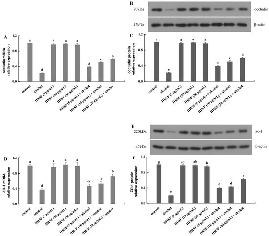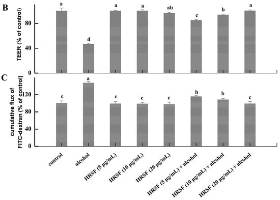 The TEER assay was applied to estimate intestinal barrier integrity [11,27]. Briefly, Caco-2 cells were planted in the apical chamber of a 12-well transwell plate. After 21 days, cells were pre-treated with HRSF (5, 10 and 20 μg/mL) in serum-free medium for 1 h prior to treatment with 7.5% alcohol for 24 h in a protective group. Meanwhile, wells treated only with alcohol or only with HRSF were used as the alcohol-induced damage group or the HRSF-alone treatment group, respectively. Cells without alcohol and HRSF served as the control group. The medium was removed, the apical chamber and basolateral chamber were filled with 37 °C Hank’s Balanced Salt Solution to wash the cells twice, and then the mixture was incubated at 37 °C with Hank’s Balanced Salt Solution for 30 min. Finally, TEER was estimated with an epithelial volt-ohmmeter ERS-2 (Merck Millipore, Burlington, MA, USA). Resistance values (Ω·cm2) were calculated by multiplying the area of the membrane filter. The results were expressed as TEER (% of control) = (TEERtreatment/TEERcontrol) × 100%.