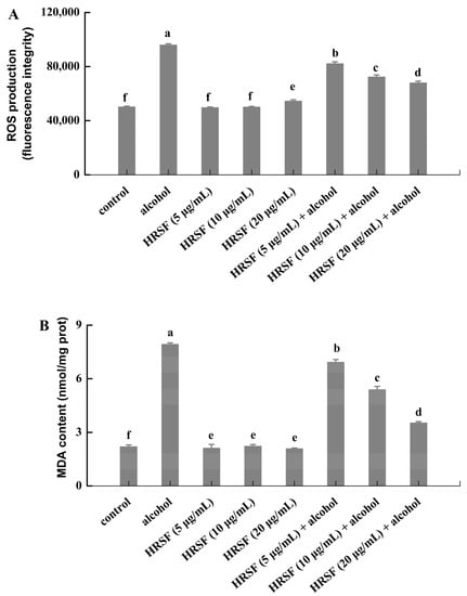 3.4. HRSF Attenuated the Alcohol-Induced Generation of ROS and MDA in Caco-2 Cells