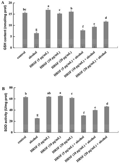 Meanwhile, the levels of GSH were increased by 19.1%, 43.2%, and 79.1% in the alcohol treatment group for pre-incubation with 5, 10, and 20 μg/mL HRSF (Figure 5A). In parallel, it also reversed the inhibiting effect of alcohol on SOD activity by 19.5%, 57.4%, and 82.9%, respectively (Figure 5B). However, no significant difference of GSH level and SOD activity was observed between cells challenged exclusively with HRSF and the control cells (Figure 5). Thus, it was obvious that HRSF could restore the redox homeostasis, which was inhibited by alcohol through increasing the GSH content and SOD activity in a dose-dependent manner.