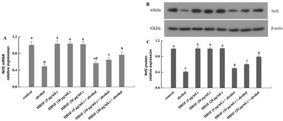 Nrf2 is a critical nuclear transcription regulator of cells for resisting oxidative stress [52]. It is usually located in the cytoplasm by combining with its negative mediator Keap1 (Kelch-like ECH-associated protein 1) in an inactive state. However, upon stimulation, Nrf2 is activated through dissociating from Keap1 and enters into the nucleus. Then, the activated Nrf2 binds to the antioxidant response element (ARE), which induces the downstream activation of the endogenous antioxidant system [53]. Evidence has shown that Nrf2 plays a key role in maintaining the integrity of the intestinal barrier through alleviating oxidative stress and regulating TJs expression [54]. To elucidate the protection mechanism of HRSF on the intestinal barrier against alcohol, the mRNA and protein levels of Nrf2 were examined. As shown in Figure 6, the mRNA and protein levels of Nrf2 were decreased by 51% and 59% in the alcohol treatment group compared with the control. A previous report also found a similar effect of alcohol on Nrf2 [32]. However, this inhibition induced by alcohol was mitigated by pre-incubation with HRSF in a dose-dependent manner. A 20 μg/mL HRSF pre-incubation before alcohol treatment was able to reverse the mRNA and protein expression of Nrf2 to nearly 80% of the control group. Additionally, the HRSF-alone treatment did not have a significant effect (Figure 6).