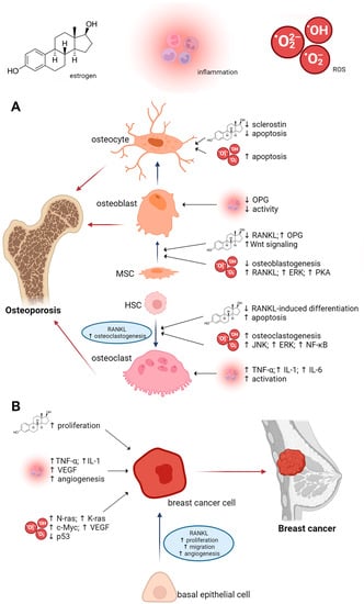 The impact of RANKL, estrogen, ROS, and inflammation on the development of osteoporosis (A) and breast cancer (B) (created with BioRender.com, https://www.biorender.com/, accessed on 27 January 2023). Abbreviations: c-Myc—c-myelocytomatosis oncogene product; ERK—extracellular signal-regulated kinase; HSC—hematopoietic stem cell; IL-1—interleukin 1; IL-6—interleukin 6; JNK—c-Jun N-terminal kinase; K-ras—Kirsten rat sarcoma viral oncogene homolog; MSC—mesenchymal stem cell; N-ras—neuroblastoma RAS viral oncogene homolog; NF-κB—nuclear factor kappa-B; OPG—osteoprotegerin; p53—tumor protein p53; PKA—protein kinase A; RANKL—receptor activator of nuclear factor kappa-B ligand; ROS—reactive oxygen species; TNF-α—tumor necrosis factor-alpha; VEGF—vascular endothelial growth factor; ↑—increased; ↓—decreased.