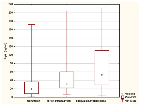 Leptin is the first parameter that differs between malnourished patients and those having a normal nutritional status. The comparison of the medians, presented in Figure 1, revealed a statistically significant increase in the leptin concentration in the case of people with a normal nutritional status, which means a decrease in its level along with a deepening of malnutrition.