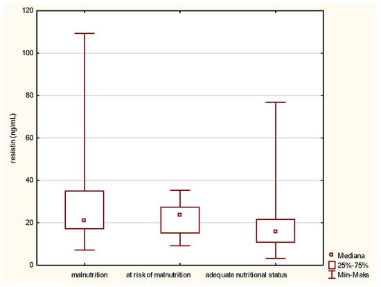 In the matter of resistin (Figure 2), its level is inversely related to the improvement of the patient nutritional status. A high concentration of resistin was noted in the fraction containing malnourished people. Along with the improvement of the nutritional status, designated using the MNA, the concentration of the tested adipokine was reduced.