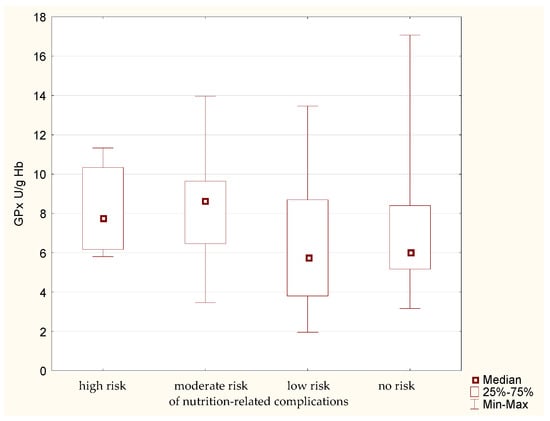 With regard to GPx, higher median enzyme activity was found in the senile patients at high and moderate risk of nutrition-related complications compared to low and no risk of such complications (Figure 4). In the patients at high risk of nutrition-related complications, the enzyme activity hardly decreased below 6 U/g Hb, which was observed in other groups. High GPx activity in patients at high risk of nutrition-related complications according to the GNRI might indicate the highest level of oxidative stress in this group of patients. Both current results and previous reports indicate that there is an inverse relation between oxidative stress and the nutritional status of older patients [9,45]. Moreover, severe oxidative stress is linked to a presence of metabolic syndrome in older individuals [46].