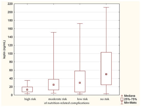 The analysis of leptin in relation to the GNRI showed a similar result as for the MNA. There was a statistically significant difference between the group of people at high risk and those without risk of nutrition-related complications. Leptin level is the highest in the fraction of people without a risk of nutrition-related complications. On the contrary, the lowest level of this parameter was determined in the group of senile patients with the highest risk of nutrition-related complications. In other words, the analysis of medians (Figure 5) indicates a gradual increase in the leptin concentration, along with a decrease in the risk of nutrition-related complications.