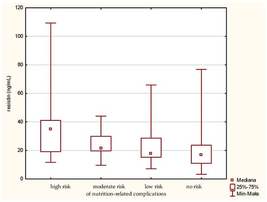 The highest level of resistin was determined in the older patients at high risk of nutrition-related complications (Figure 6). Significant differences were found between the groups designated by the GNRI as high risk and no risk of nutrition-related complications. The analysis showed the greatest difference between these groups. A gradual decrease in the concentration of resistin was also observed along with minimizing the risk of nutrition-related complications. The confirmation of this result was obtained by also using the MNA classification of the patients.