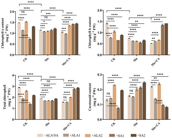 Effects of 5-aminolevulinic acid or salicylic acid (ALA/SA) combined with citric acid (CA) on chlorophyll a, chlorophyll b, total chlorophyll and carotenoid contents under manganese (Mn) treatment in sunflower plants. CA means 20 mmol kg−1 citric acid treatment. ALA1/ALA2 indicates spraying with 10/20 mg L−1 ALA. SA1/SA2 indicates spraying with 50/100 mg L−1 SA. CK, control plants without any treatment; Mn means that plants were exposed to 0.8 g kg−1 Mn for 7 days; Mn + CA indicates plants treated with CA for 7 days after Mn treatment. Mn + CA + ALA/SA treatment indicates plants treated with ALA/SA for one week after CA treatment. Note: Data are the means of three replicates (mean ± SE). * indicates a significant difference at p-value < 0.05, ** p-value < 0.01, *** p-value < 0.001, **** p-value < 0.0001; ns indicates no significant difference according to Tukey’s multiple comparisons test.