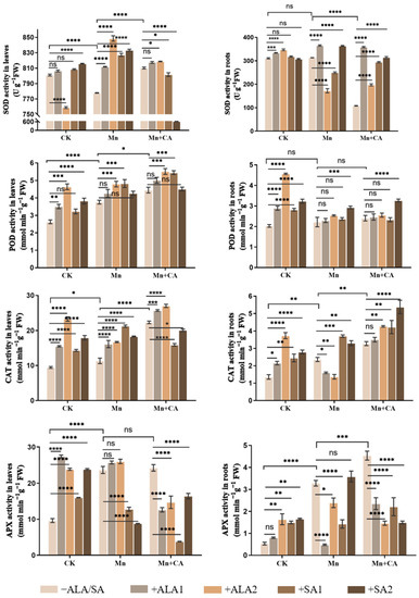 Effects of 5-aminolevulinic acid or salicylic acid (ALA/SA) combined with citric acid (CA) on antioxidant enzyme activities in the leaves and roots of manganese (Mn)-treated sunflower plants. CA means 20 mmol kg−1 citric acid treatment. ALA1/ALA2 indicates spraying with 10/20 mg L−1 ALA. SA1/SA2 indicates spraying with 50/100 mg L−1 SA. CK, control plants without any treatment; Mn means that plants were exposed to 0.8 g kg−1 Mn for 7 days; Mn + CA indicates plants treated with CA for 7 days after Mn treatment. Mn + CA + ALA/SA treatment indicates plants treated with ALA/SA for one week after CA treatment. Note: Data are the means of three replicates (mean ± SE). * indicates a significant difference at p-value < 0.05, ** p-value < 0.01, *** p-value < 0.001, **** p-value < 0.0001; ns indicates no significant difference according to Tukey’s multiple comparisons test.