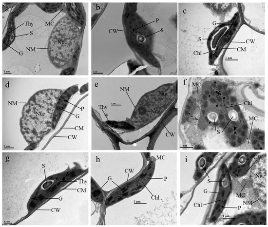 Effects of 5-aminolevulinic acid or salicylic acid (ALA/SA) combined with citric acid (CA) on electron micrographs of leaf mesophyll cells of manganese (Mn)-treated sunflower plants. (a–c) represent electron micrographs of mesophyll cells of sunflowers under CK, Mn and Mn + CA treatment, respectively; (d–f) represent electron micrographs of mesophyll cells of sunflowers under ALA, Mn + ALA and Mn + CA + ALA treatment, respectively; (g–i) represent electron micrographs of mesophyll cells of sunflowers under SA, Mn + SA and Mn + CA + SA treatment, respectively. CK, control plants without any treatment; Mn, plants exposed to 0.8 g kg−1 of manganese for 7 days; CA means 20 mmol kg−1 citric acid treatment. ALA/SA indicates spraying with 20/100 mg L−1 ALA/SA. Mn + CA, plants treated with CA for 7 days after Mn treatment. Mn + CA + ALA/SA treatment indicates plants treated with ALA/SA for one week after CA treatment. Plates explanation: MC, mitochondria; Chl, chloroplasts; NM, nuclear membrane; Thy, thylakoid; Nuc, nucleus; Nue, nucleolus; CW, cell wall; CM, cell membrane; P, plastoglobuli; S, starch; G, grana; Vac, vacuole. (a,b,d,e)—×20,000, (c,f,h,i)—×25,000, (g)—×30,000.