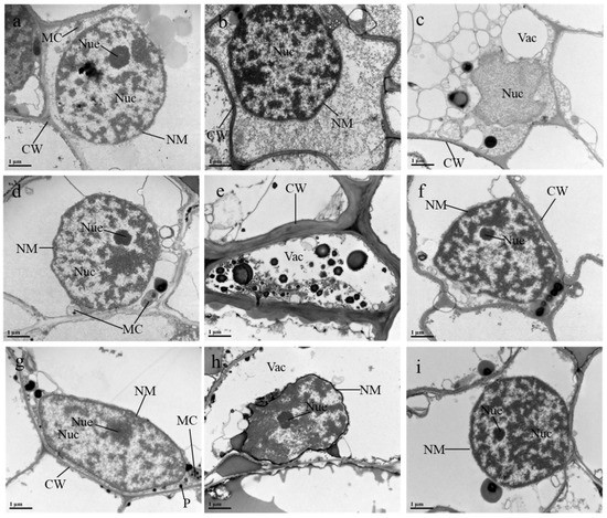Different treatments also significantly affected ultrastructural changes in root-tip cells (Figure 5). Control plants had typical mature cells with a definite cell wall, containing a complete nucleus and clear mitochondria, and the nucleus had a nuclear membrane and nucleolus (Figure 5a). The Disappearance of the nucleolus, deepening of the nuclear matrix and deformation of the cell wall were some of the other obvious changes observed under Mn-treated cells (Figure 5b). There was a significant increase in the number and area of vacuoles in root-tip cells. Moreover, the nucleus was severely collapsed and the nucleolus became invisible in the Mn + CA treatment (Figure 5c). Compared with the control, no significant changes were noticeable under the treatment of AL. The cell contained a complete nucleus and numerous mitochondria with smooth cell walls and cristae (Figure 5d). However, numerous ultrastructural alterations were noticed in root meristematic cells of the plants exposed to Mn combined with 20 mg L−1 ALA. There was an increased Mn deposition in the vacuoles, and most of the organelles disappeared (Figure 5e). The application of ALA significantly improved the cell shape and showed a clear and intact nucleus in Mn + CA treated cells (Figure 5f). Further, applying SA alone resulted in several plastoglobuli inside the stroma and mitochondria and also caused a deformed nucleus with an unclear nucleolus (Figure 5g). SA + Mn-treated plants presented cells with a large vacuole and deformed nucleus as well as a dissolved cell wall (Figure 5h). Similarly, CA reversed the negative effects of Mn + SA on nuclear structure, including the nuclear membrane and nucleolus (Figure 5i).