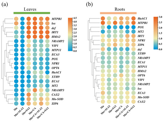 Based on RT-qPCR profiling, different relative expression patterns were identified for different treatments on sunflower growth (Figure S2). During Mn treatment, significantly up-regulated changes were detected for the relative expression of the MTPB1, def, lox and HMA2 genes in leaves compared with the control, which was normalized as “1”. For example, the JA-responsive gene lox was 9.05-fold higher in Mn-treated leaves than in the control. However, most of the genes in leaves, e.g., POX, HaAC1, NPR1, OPT6, CAX2, ZIP6, VIP1, MTP11, NRAMP2, NRAMP3, MT2, ECA3 and XTH, were significantly down-regulated in response to Mn treatment. In contrast, these genes were significantly up-regulated in response to ALA2 under Mn treatment. The application of CA significantly up-regulated the expression levels of the IRT1, CAX2, ZIP6, VIP1, MTPB1, MTP11, NRAMP3, def, lox, HMA2, ECA3 and XTH genes compared with Mn alone. SA promoted expression levels of most of the studied genes (including ECA1 and XTH) except for NRAMP2 and MT2 in the Mn + CA treatment (Figure S2a). In sunflower roots, the NPR1 and MTPB1 genes were significantly up-regulated while POX, NRAMP3, MT2, ECA1 and MTPB1 were significantly down-regulated under all treatments (Mn, CA, ALA and SA) compared with their respective controls. Other genes, such as Mn-SOD, OPT6, CAX2, VIP1, NRAMP2 and HMA2, showed no significant difference in response to any treatments used in this study in sunflower roots (Figure S2b).