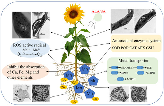 ALA and SA significantly promoted the Mn absorption of shoots under Mn alone or with CA. ALA/SA significantly increased the root Mn concentration under Mn treatment. However, the application of ALA/SA significantly reduced the absorption of Mn in sunflower roots under Mn + CA stress. It might be that ALA/SA could act as a pump transporting Mn ions from roots to shoots. The Mn bioaccumulation quantity (BCQ) and removal efficiency (RE) in sunflowers further demonstrated the effects of ALA/SA under Mn + CA treatment. These results were similar to the findings of Cd transport mediated by ALA in sunflowers [9]. Previous studies found that foliage spray of ALA could protect cell membranes from lipid peroxidation [39] by triggering the activities of antioxidant enzymes and scavenging ROS [10,11,12]. Moreover, a suitable concentration of ALA treatment could be a benefit for chlorophyll biosynthesis and the consequent accumulation of carbohydrates [12]. Thus, suitable PGRs have positive effects on sunflower growth by regulating the uptake of Mn. However, with the increase in Mn concentration in the shoot from the Mn + CA to the Mn + CA + ALA/SA treatment, the biomass declined significantly. This might be due to excessive Mn content in the sunflower shoot tissues. Thus, we draw a schematic diagram (Figure 7) to illustrate the dual (beneficial/toxic) effects of ALA/SA combined with CA on the phenotypic, physio-biochemical, ultrastructure and molecular processes in Mn-treated H. annuus plants.