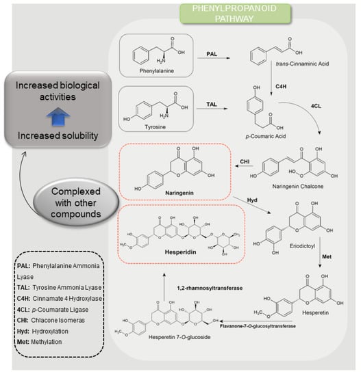 Secondary metabolites are generated during the biosynthesis process, which, for naringenin and hesperidin, follow a common pathway through the phenylpropanoid pathway. First, the phenylalanine is transformed into p-coumaronyl-CoA through the action of the enzymes phenylalanine ammonia-lyase (FAL), cinnamate 4-hydroxylase (C4H), and 4-coumaronyl-CoA ligase (4CL). Then, three malonyl-CoA molecules combine with one p-coumaronyl-CoA to form an aromatic ketone converted to naringenin (Figure 2). Subsequent events of hydroxylation and methylation result produce hesperidin [74]. Actinomycetes can also make naringenin. The bacterium Streptomyces clavuligerus synthesizes naringenin using p-coumaric acid and the P450 monooxygenase enzyme as pathway initiators rather than the general phenylpropanoid pathway seen in plants. Other bacteria in the genus Streptomyces can produce naringenin by the same principle, using p-coumaric acid or other pathway initiators, such as caffeic acid and benzoic acid [83].