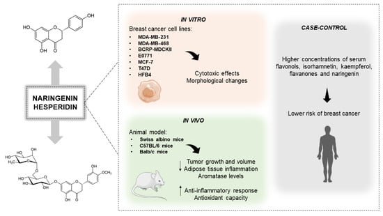 Indeed, under in silico, in vitro, and in vivo approaches, naringenin and hesperidin can interfere with or target distinct cellular pathways in breast cancer cells (Table 2). However, many of these mechanisms still need to be fully understood, which may influence clinical outcomes. Because of this, it is interesting to consider further investigations for possible therapeutic applications.