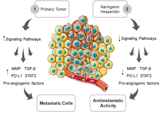 Antimetastatic potential of naringenin and hesperidin. (1) The primary tumor is capable of metastasis under the influence of abnormal signaling pathways, such as increased expression of activator of transcription 3 (STAT3), transforming growth factor-β (TGF-β), pro-angiogenic factors, matrix metalloproteinases, and programmed death ligand 1 (PD-L1); (2) Administration of naringenin and hesperidin inhibited tumor cell migration by blocking these activated signals, which reverse the epithelial-mesenchymal transition (EMT) process and consequent loss of ability to disseminate.