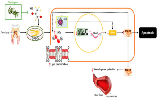 - Delle Monache, S.; Pulcini, F.; Frosini, R.; Mattei, V.; Talesa, V.N.; Antognelli, C. Methylglyoxal-Dependent Glycative Stress Is Prevented by the Natural Antioxidant Oleuropein in Human Dental Pulp Stem Cells through Nrf2/Glo1 Pathway. Antioxidants 2021, 10, 716. [Google Scholar] [CrossRef] [PubMed]