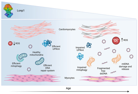 Age-related Lonp1 effects on cardiomyocytes and myocytes. In the mitochondria of cardiomyocytes and myocytes, Lonp1 plays an important role in counteracting ROS production and maintaining mitochondrial homeostasis through efficient mitophagy, DNA repair system, and UPRmt response. During aging, Lonp1 levels decrease, leading to higher ROS levels, impaired mitophagy, release of damaged mtDNA and fragmented dsDNA, and impaired UPRmt response, a series of effects that can favour myocyte damage in skeletal muscle and sarcopenia.